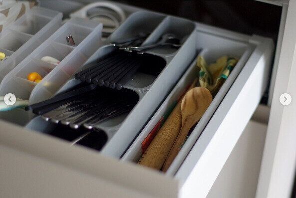 こちらはセリアのペン立てにカトラリーを収納している例です。子ども用の小さなフォークやスプーンなどはぴったりですね。斜めに入れることができるので、とても取り出しやすそう!