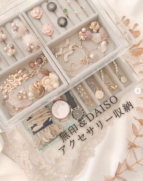 どんどん増えるアクセサリーは、無印良品のアクセサリーケースにダイソーのトレイを入れて収納するのがおすすめ。パッと見て直感的に選べてみた目もかわいい、そんな収納が実現します。