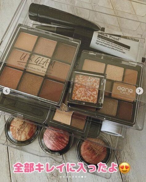 ごちゃごちゃしてしまいがちなコスメも、ダイソーのクリアケースに収納すれば、見やすくすっきり収納することができます。とても取り出しやすそうな収納ですね。