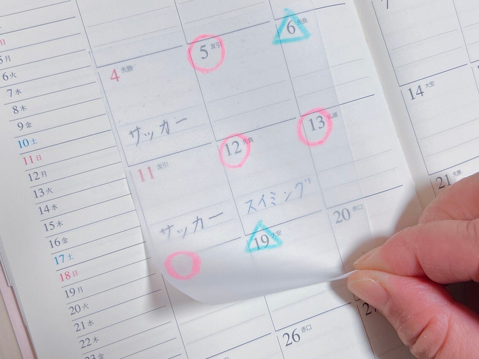 ToDoやイベントなどの予定を透明付箋紙にかき出してスケジュール帳に貼っておけば、急な予定変更でも付箋の貼り替えだけで済みます。