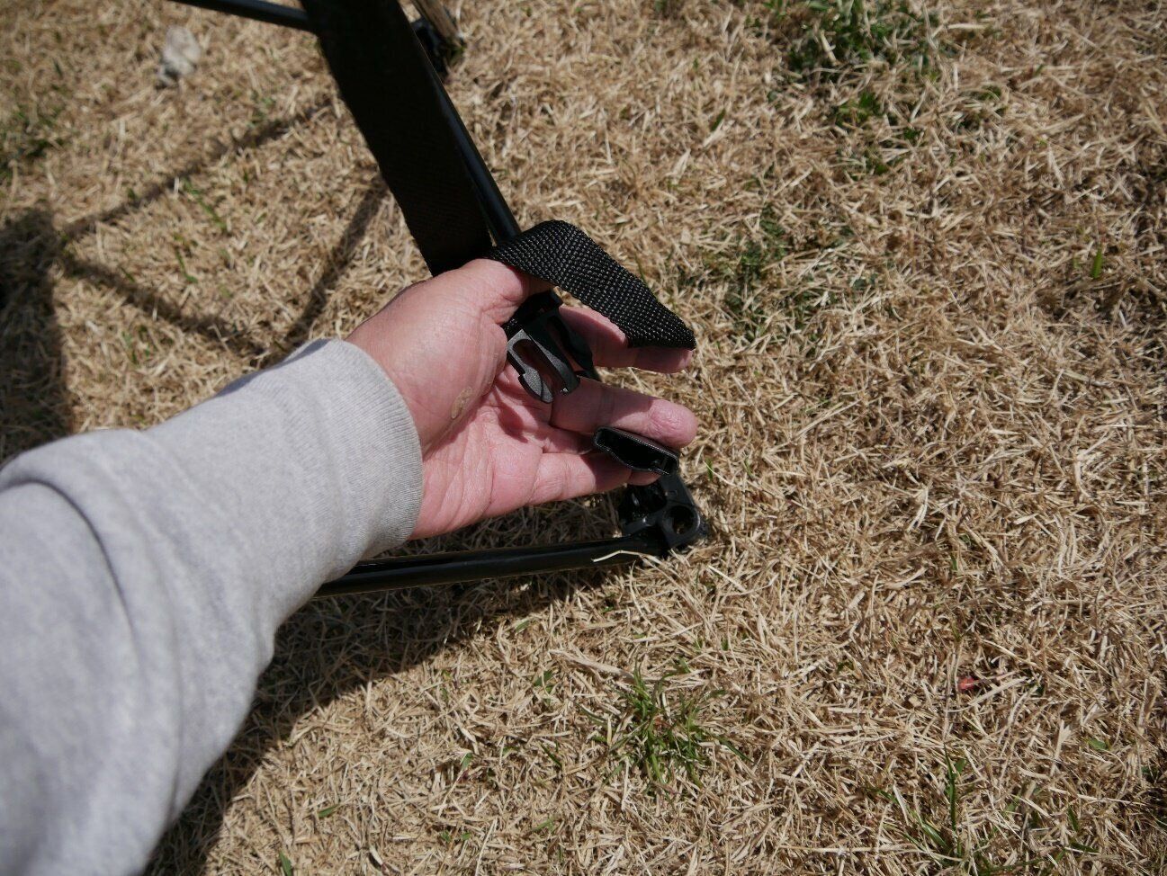 適当な場所を見つけてテーブルを組み立ててみたところ、パイプを開いて2カ所のフックを止めるだけ。わずか数10秒で、縦横45cmのテーブル完成!