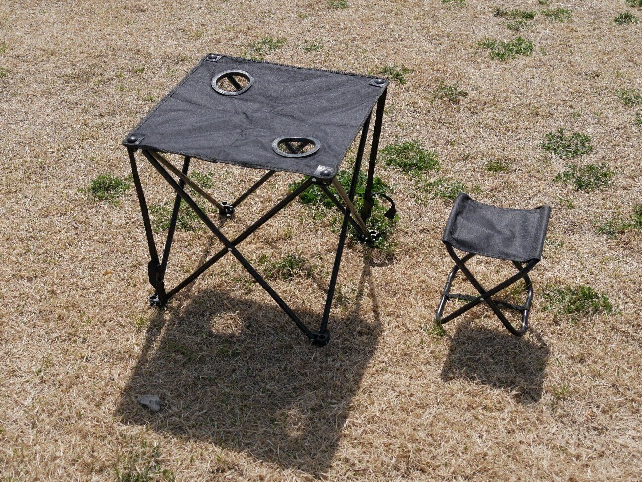 コンパクトテーブルは、ポリエステル布と軽量パイプ製で、折りたたんで持ち歩けます。収納ケースは持って歩くのが便利なように、肩紐もついています。