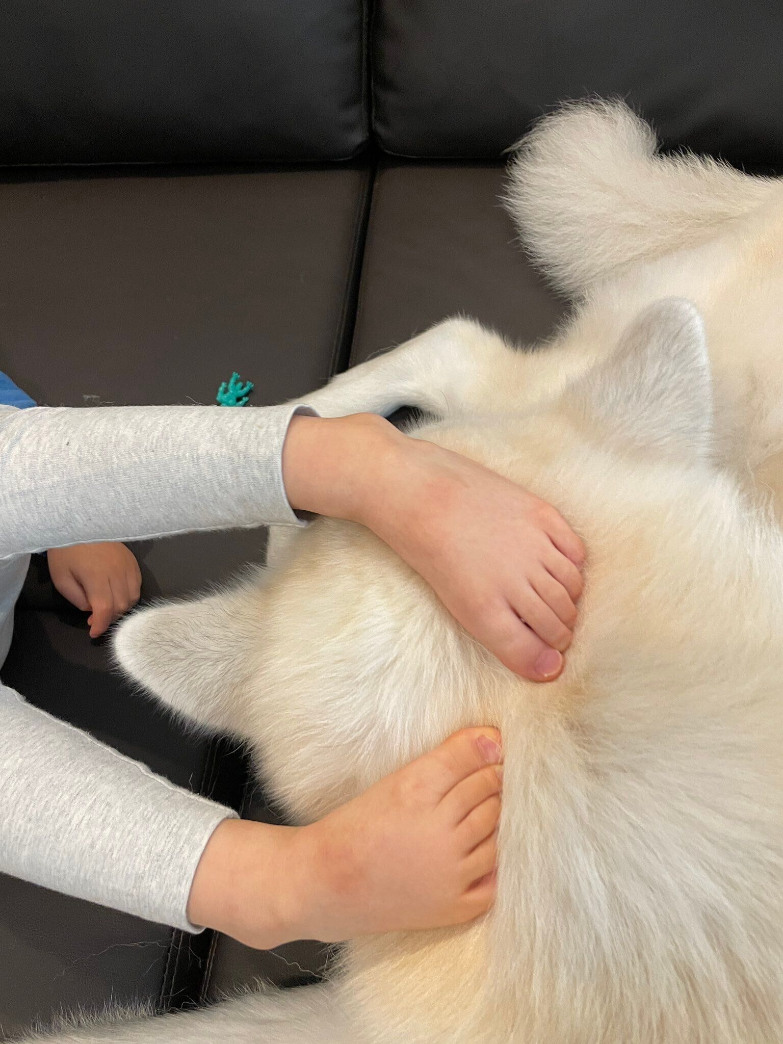 「暖をとっているのか、単純に毛が気持ちよいのかわかりませんが、わざわざ靴下を脱いで凛太郎の上に足を乗せて『おにいわん、気持ちよいね~』と言っていることがあります(笑)抱きついていることもよくありますね!」