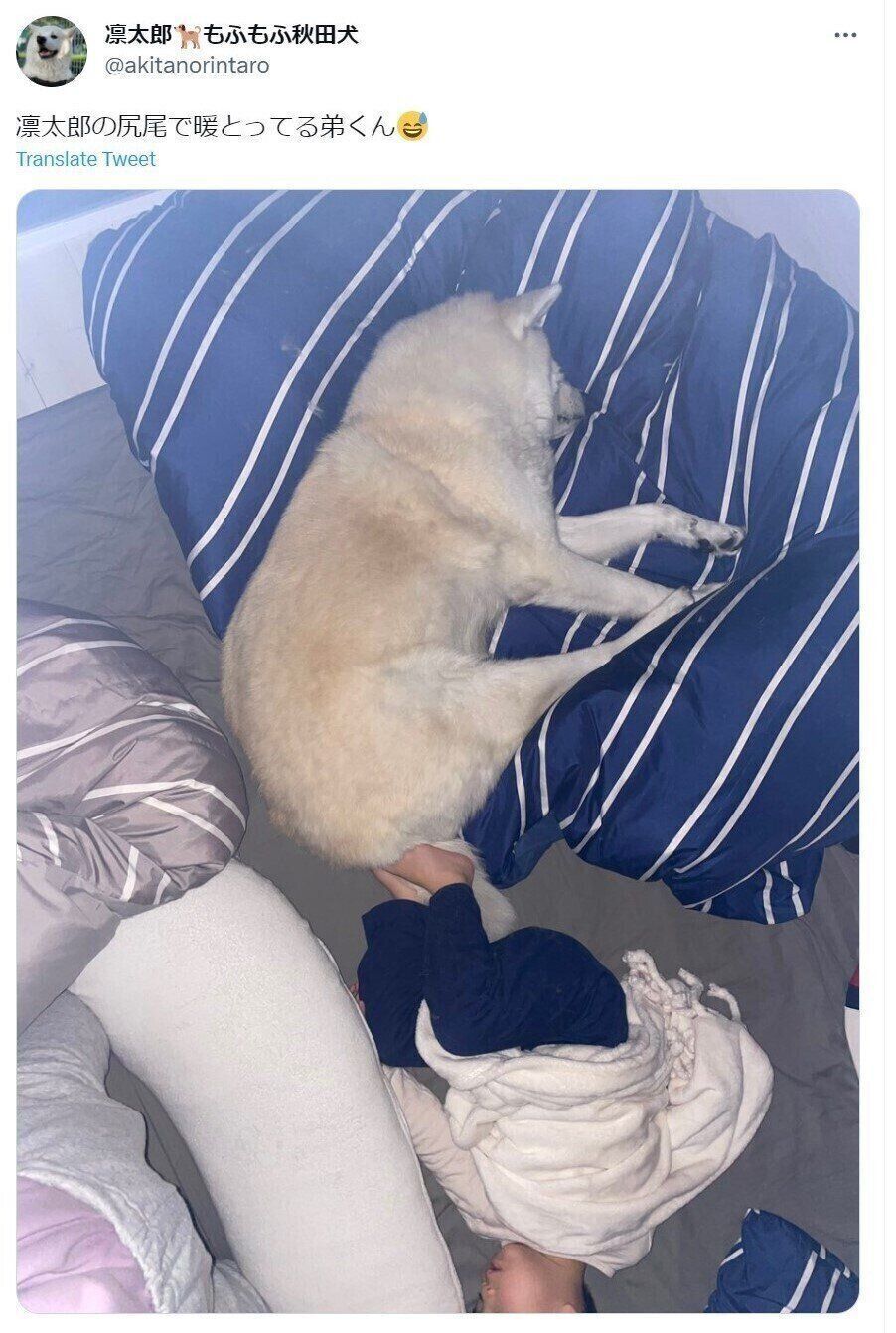 秋田犬の凛太郎くんの日常をTwitterに綴っている、凛太郎もふもふ秋田犬さん(@akitanorintaro)。「凛太郎の尻尾で暖とってる弟くん」という投稿には多数の「いいね」が寄せられています。話題の投稿についてお話しを聞きました。