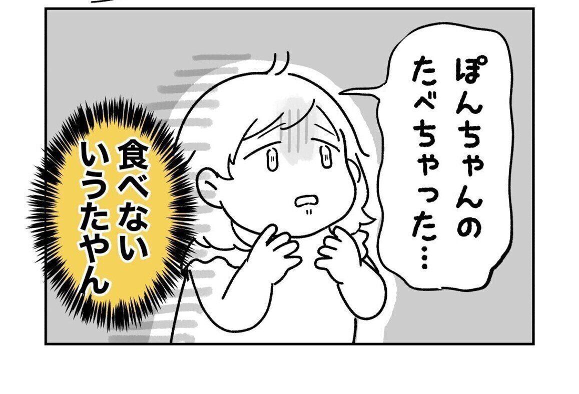 するとぽんちゃんは「ぽんちゃんのたべちゃった……」!親からすると「あんなに確認したのに」と思わずにはいられない、育児あるあるすぎるエピソードでした。
