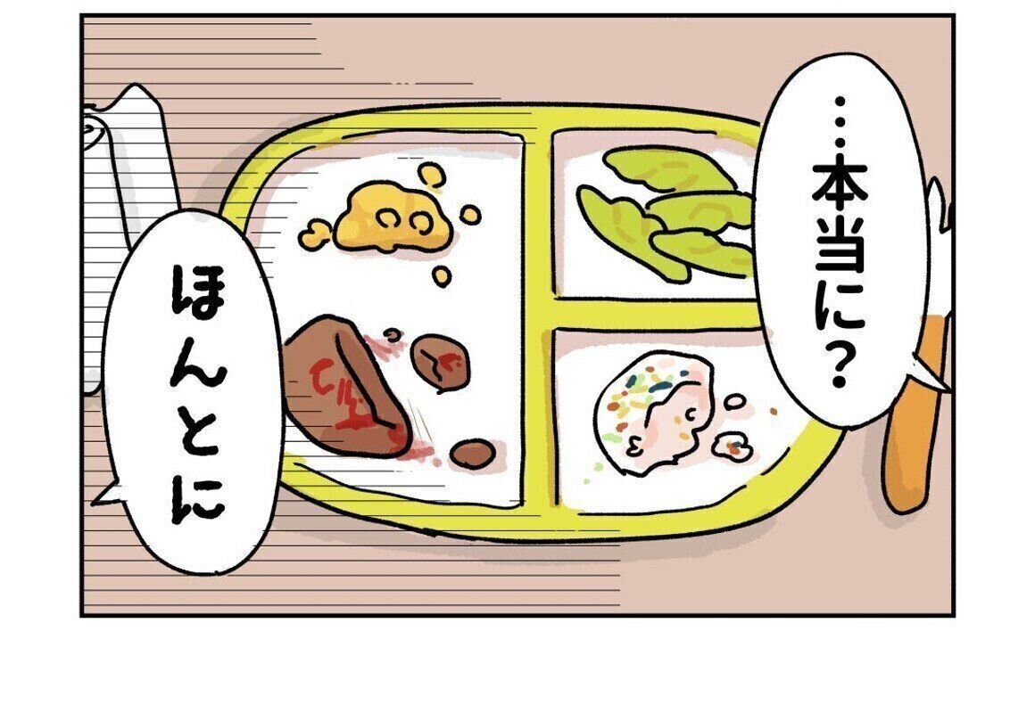 お皿の上にはご飯がまだ残っています。えぽさんは「本当に?」と確認。えぽちゃんは「ほんとに」と返します。