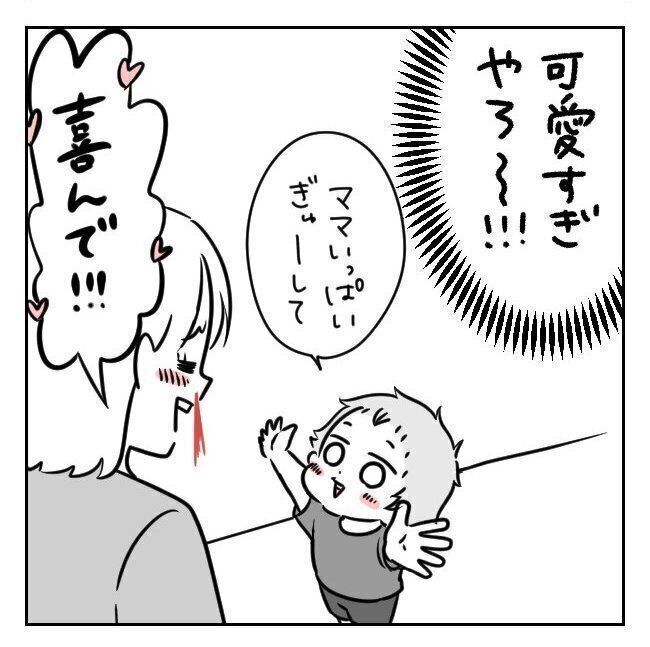 無事にトイレをすませたあと、「ママいっぱいぎゅーして」と両手をあげておねだりする息子さんに、心の中で「かわいすぎやろ~!!!」と叫びつつ、「喜んで!!!」とこたえるタソさんなのでした。