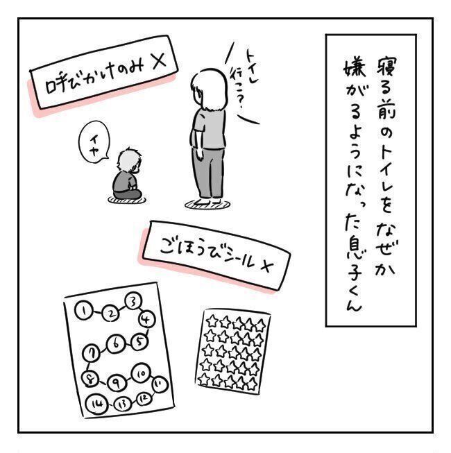 ある日、寝る前のトイレをなぜかいやがるようになった息子さん。タソさんは「トイレ行こ?」と呼びかけたり、ごほうびにシールをあげてみたりしたそうですが、残念ながら効果がなかったのだとか。