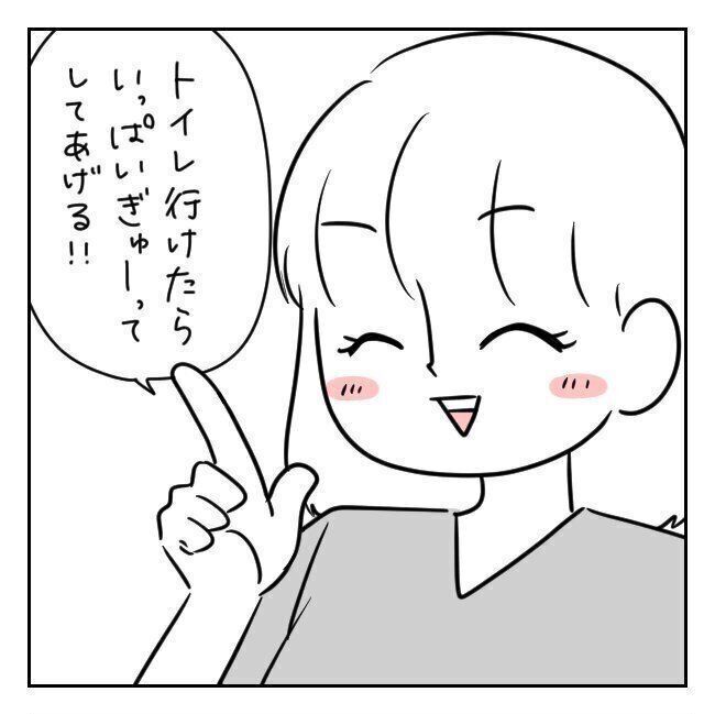 それは、「トイレ行けたら、いっぱいぎゅーってしてあげる!!」でした。さて、息子さんの反応はどうでしょうか?