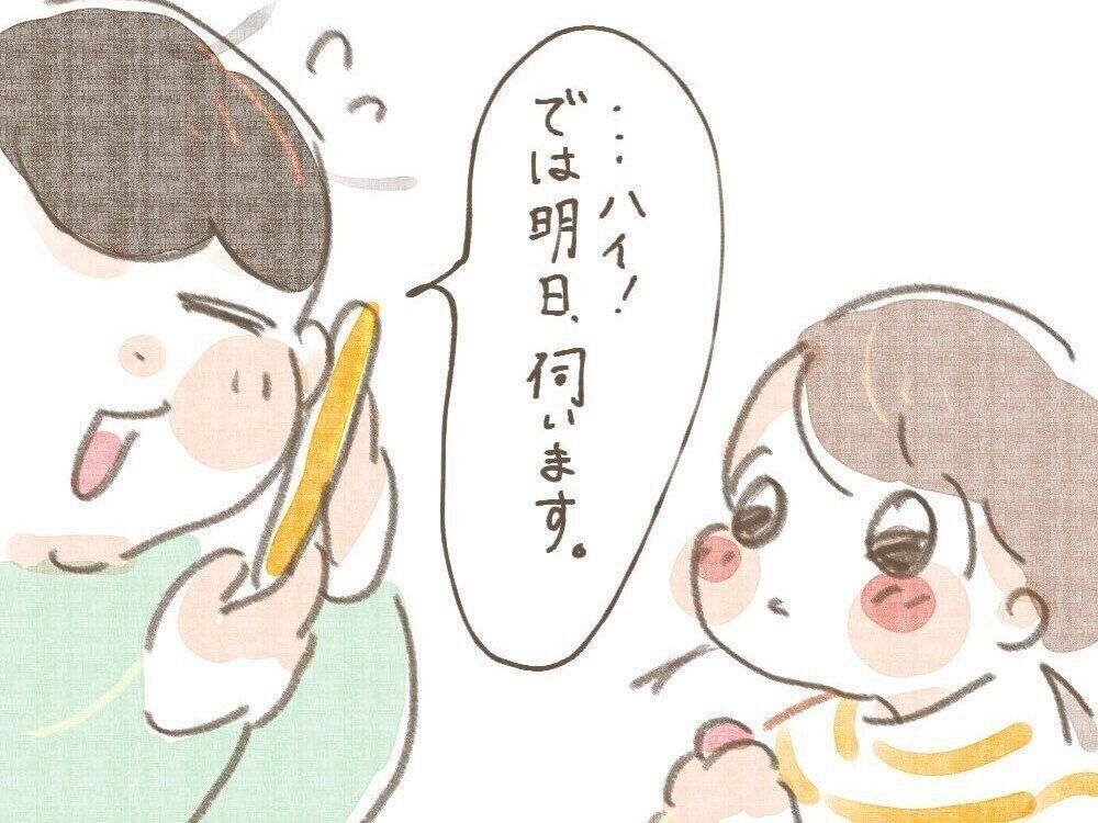 「……ハイ!では明日、うかがいます」とかしこまって電話の応対をするママ。