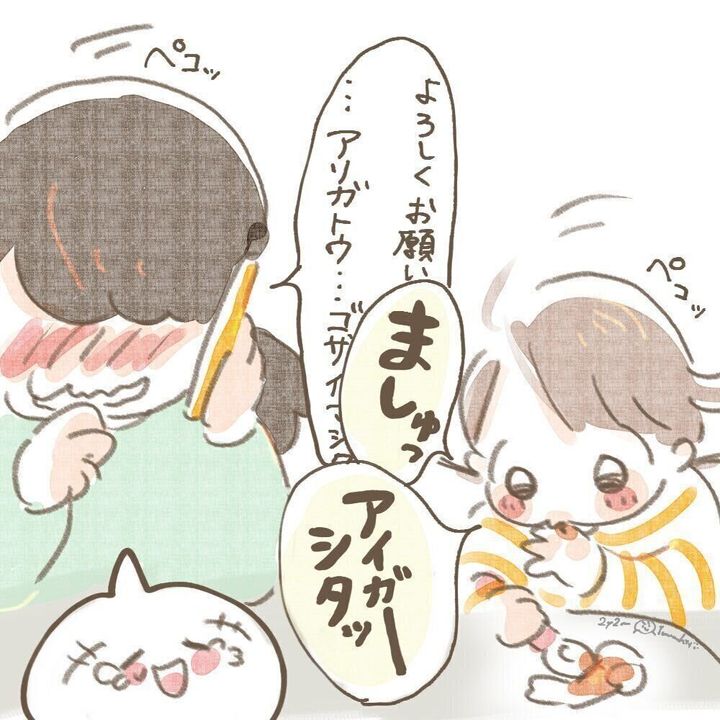 いぬのひとさん(@mohumohuwanchan)が「笑ってはいけない電話タイムだった」とコメントをして育児漫画をツイートしました。電話中のママの返事を完全にコピーする2歳の娘さん。その様子が「かわいすぎる」とコメント欄が賑わいました。