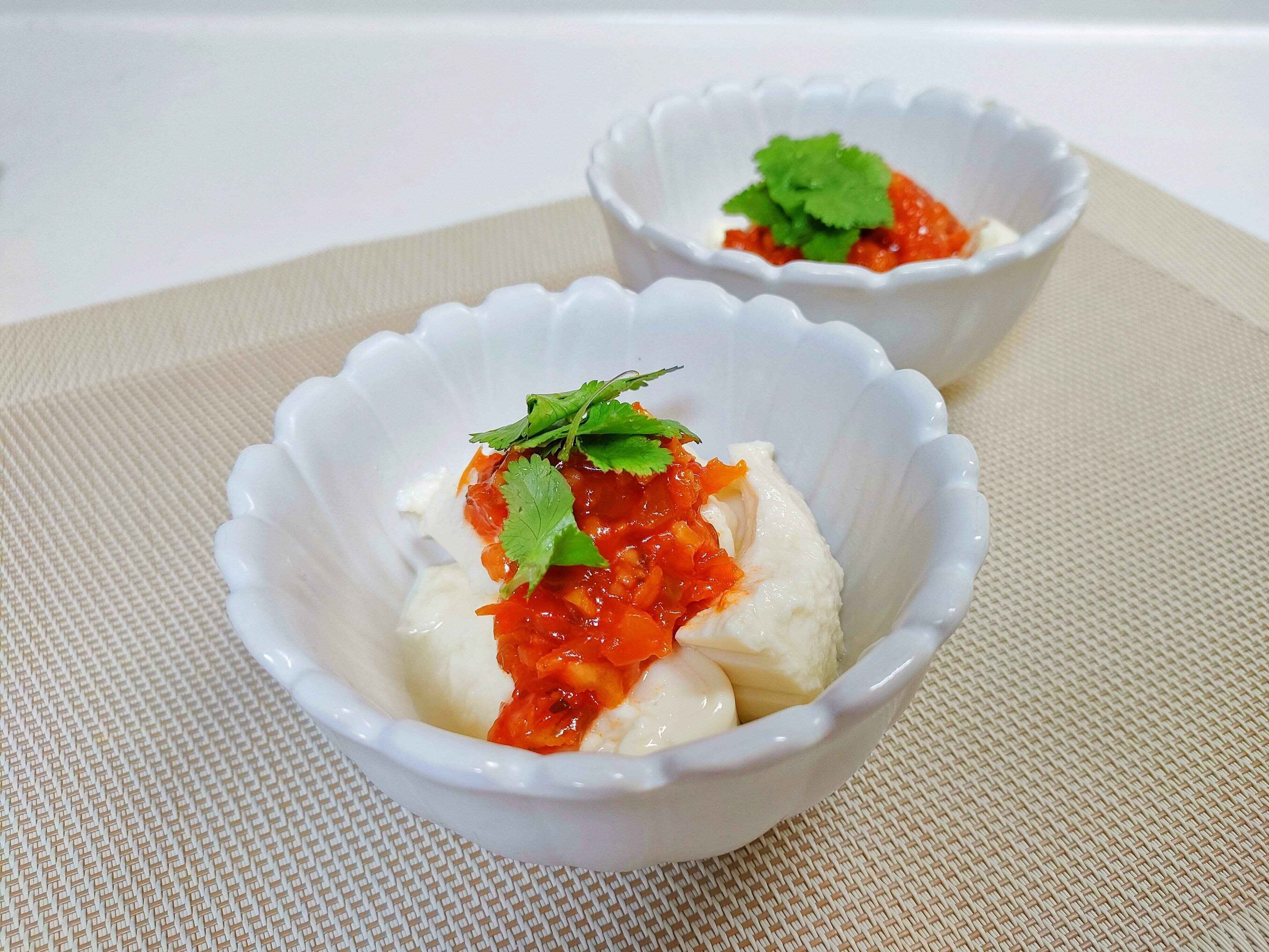 お皿に盛りつけた豆腐に、にんにくザーサイをのせてパクチーをのせるだけ!お好みでごま油やナンプラーをかけるとさらに香りが際立ちます。