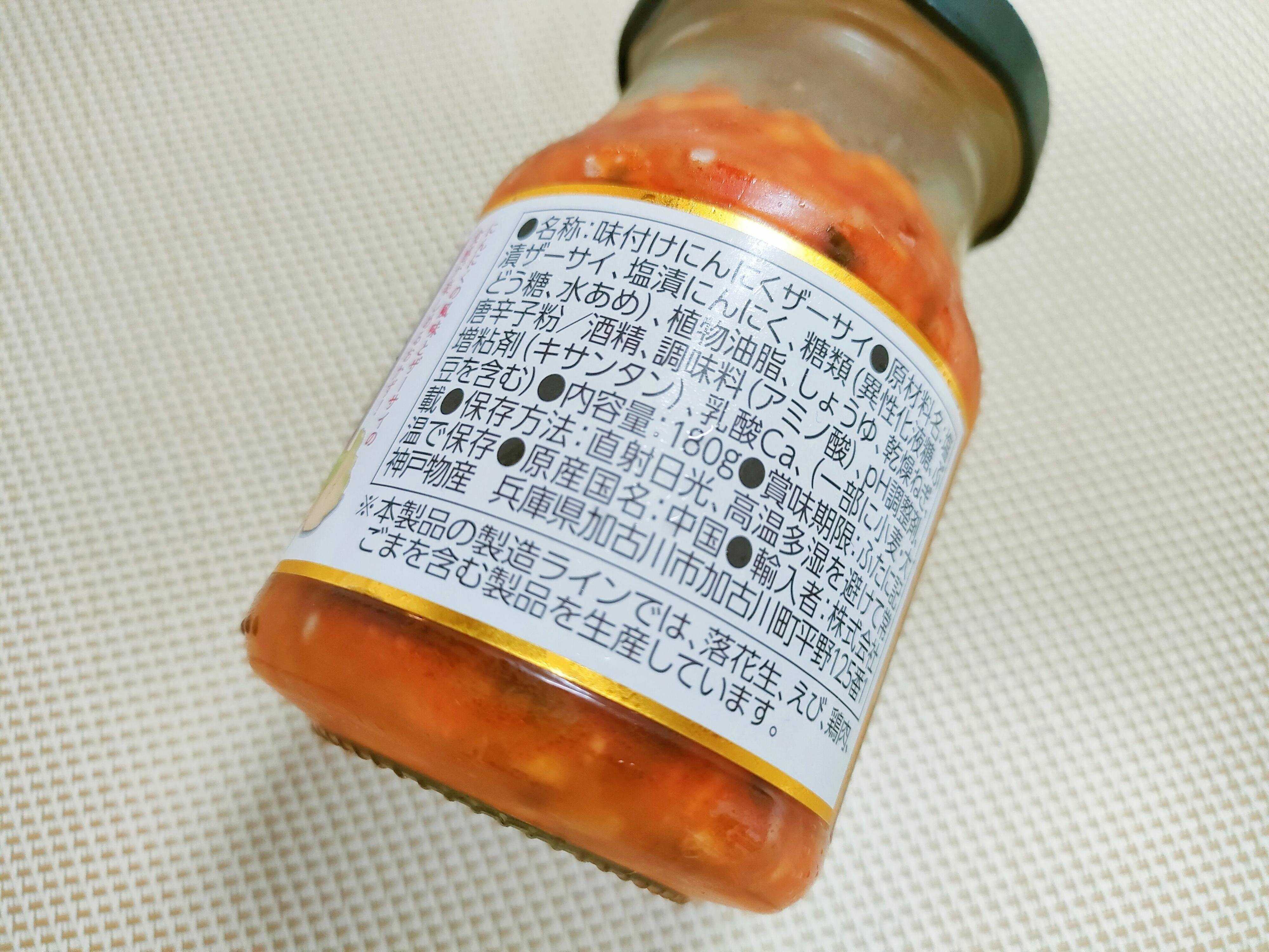 裏面表示を確認してみました。原材料には、塩漬ザーサイ、塩漬にんにく、糖類、植物油脂、しょうゆ、乾燥ねぎ、唐辛子粉が入っています。