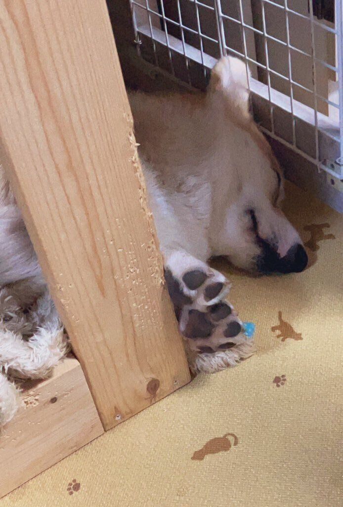 「お父さんは、くまさんのあんよが特にお気に入りです。くまさんのあんよは、3匹のコーギーの中で一番太くて、肉球は分厚くてムチムチしています。触り心地抜群で、お父さんはいつも『なんだこの足は!なんでこんなに太いんだ!』と言ってなでなでしています」