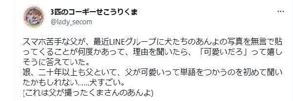 せこむ&うり&くま3🎀コギ(@lady_secom)がTwitterに投稿したツイートにたくさんのいいねが集まっています。父親のわんこ愛溢れる内容に、キュンキュンする人多数!飼い主さんにお話をうかがいました。