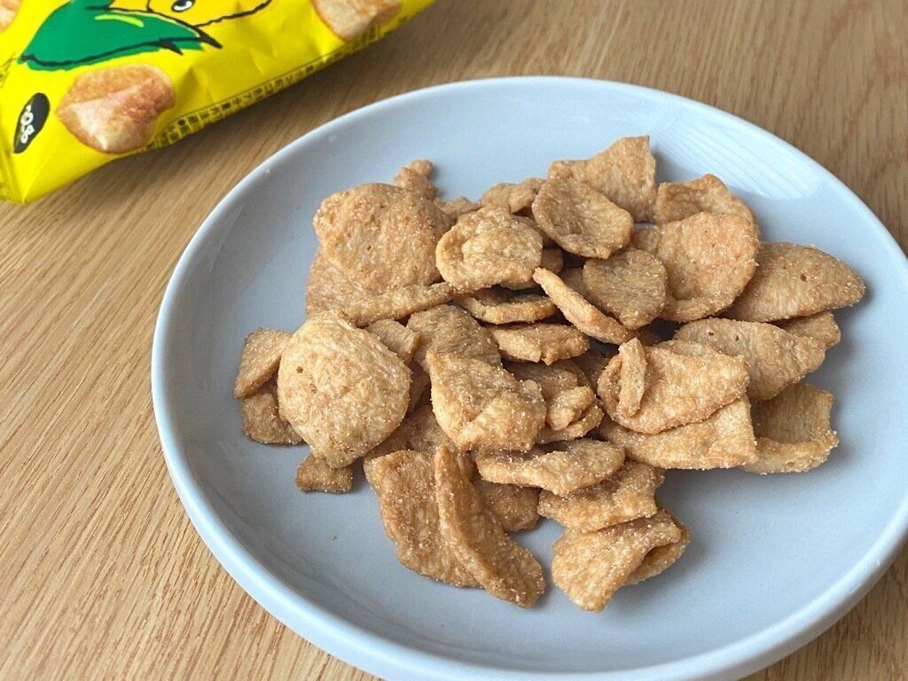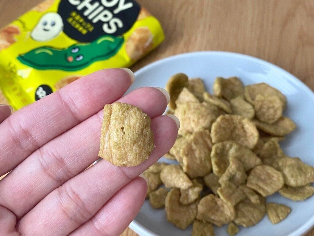 大豆チップスはガリガリ、ゴリゴリと堅めの食感で、1枚1枚が小さいながらも食べ応えが抜群。食欲をそそるとうもろこしの甘い香りがふわりと香ります。しっかりとした大豆の味に濃いめの塩味、とうもろこしの甘さがよく合っていて、ヘルシーな大豆のスナックとは思えない満足感が得られます。