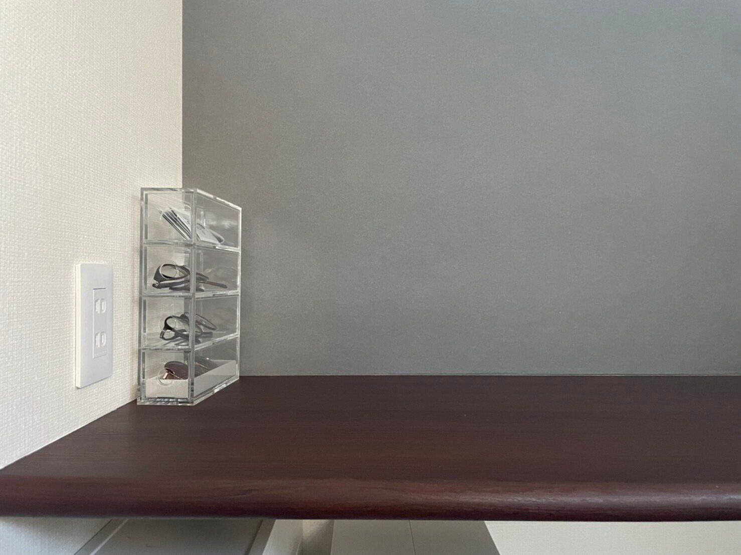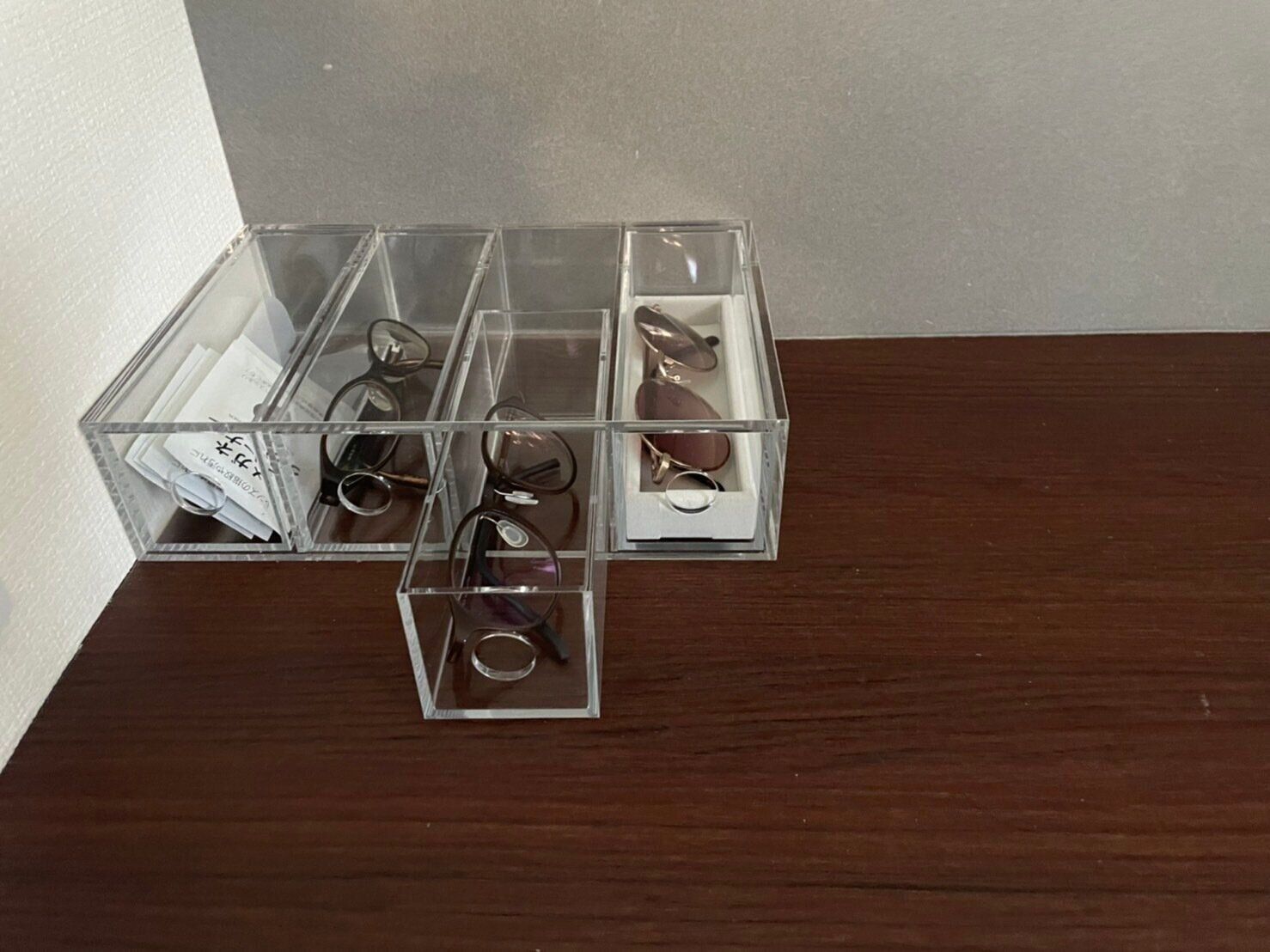 引き出しは4つあり、アクリルケースなので中身がすぐに分かります。家用メガネ、外出用メガネなどと、メガネをいくつか持っている方は、メガネの定位置があると便利ですよ。