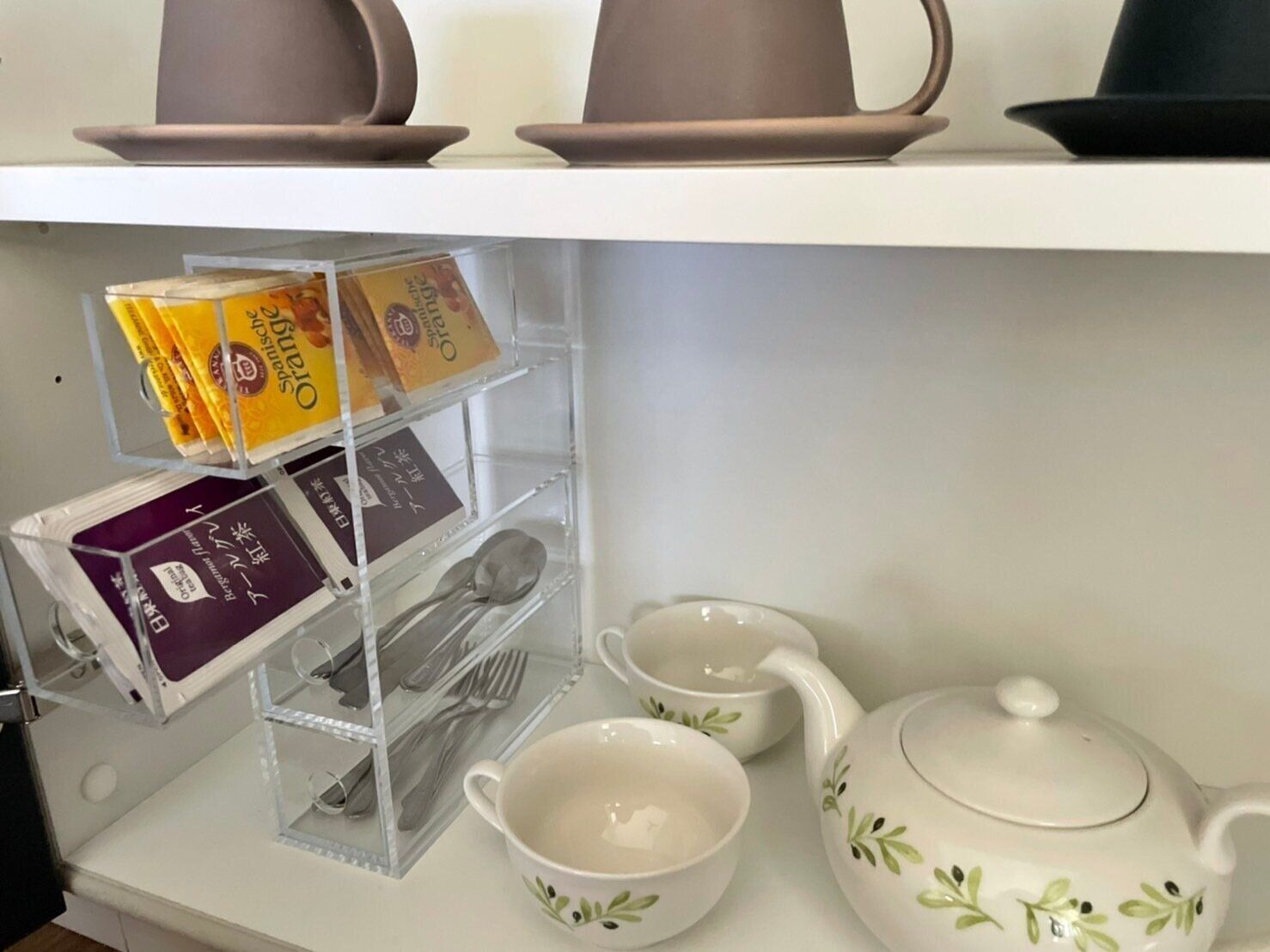 食器棚などではティーグッズ収納にも使用することができます。紅茶のティーバックや、ティースプーンやフォークを入れておくと、ティータイムの準備も楽になります。