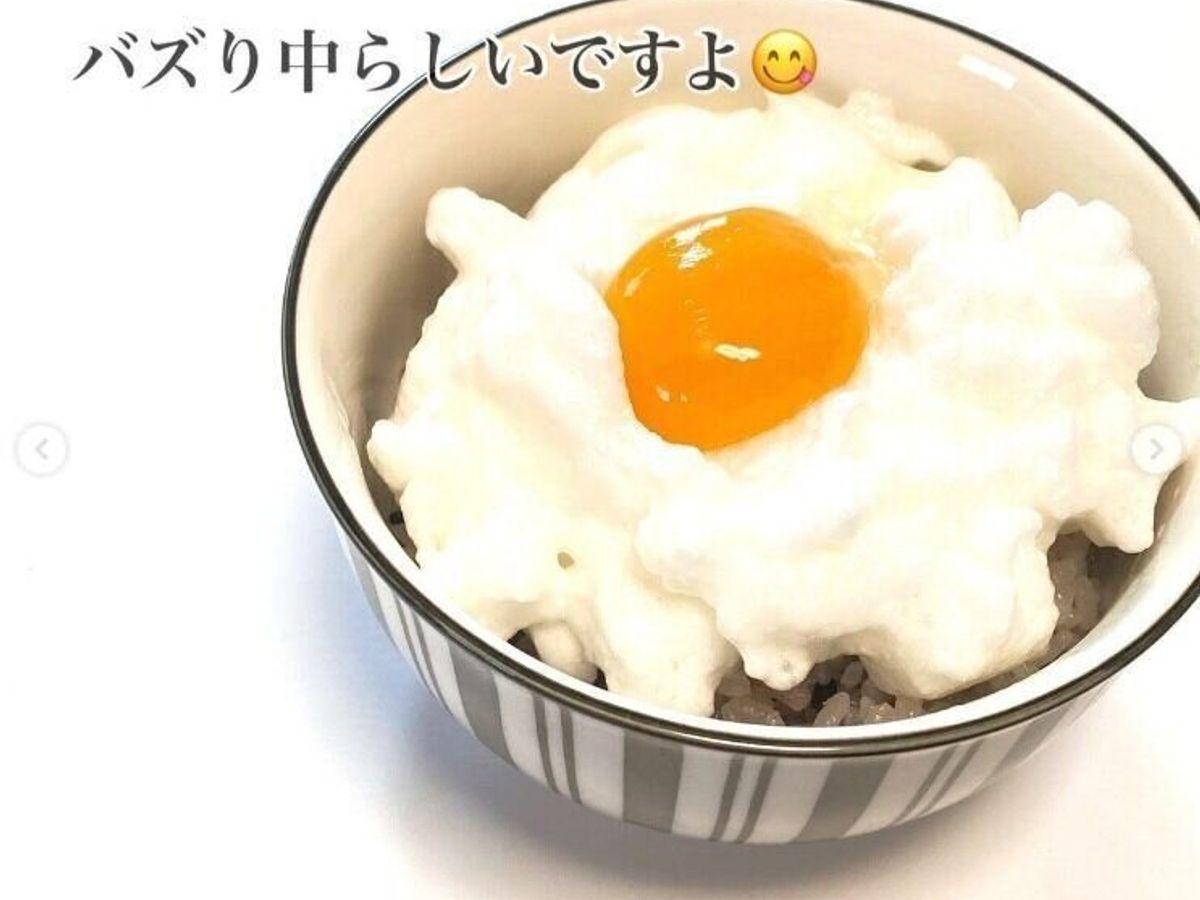 メレンゲが完成したらごはんにのせて、先に分離した黄身をのせれば完成!
