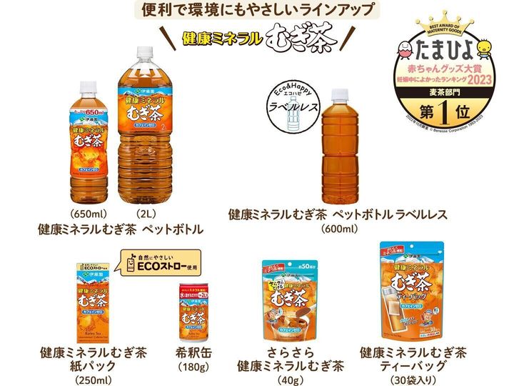 伊藤園の「健康ミネラルむぎ茶」が水分補給におすすめなのは、無糖でカフェインゼロ、カロリーゼロで、手軽にミネラルが補給できるから。そして、乳児用規格適用食品と同等の管理をしているから多くのママに支持されて、「たまひよ赤ちゃんグッズ大賞」2023年麦茶部門で第1位を獲得。実は部門創設以来8年間、連続1位に輝いています。だから、家族みんなで安心して毎日ゴクゴク飲めるんです。