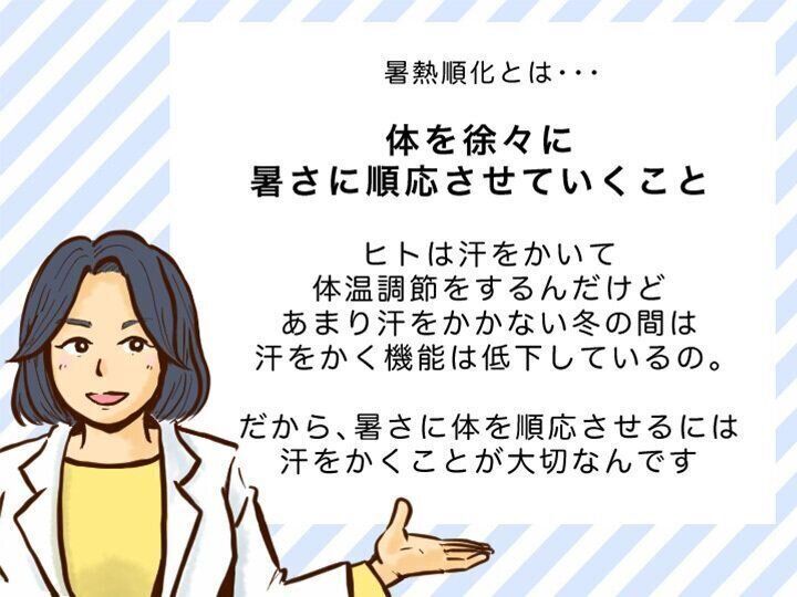 「暑熱順化(しょねつじゅんか)」とは、体が暑さに慣れること。暑さに負けない体をつくるためには、この「暑熱順化」がとっても重要なんです。暑熱順化の獲得に必要なのは、汗をかくこと。汗をかくことで、熱を発散して体温調節をする汗腺機能が高まり、暑さに対応できるようになります。