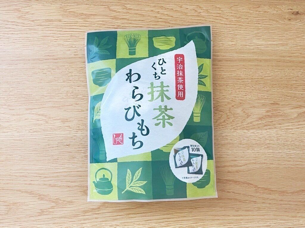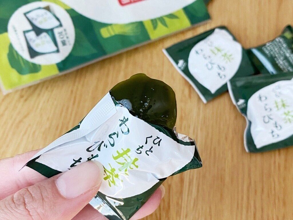 宇治抹茶を使用した風味豊かな味わいのひと口わらびもち。こんにゃく粉とわらび粉を使用することでもっちりとした食感に仕上げているんだそう。