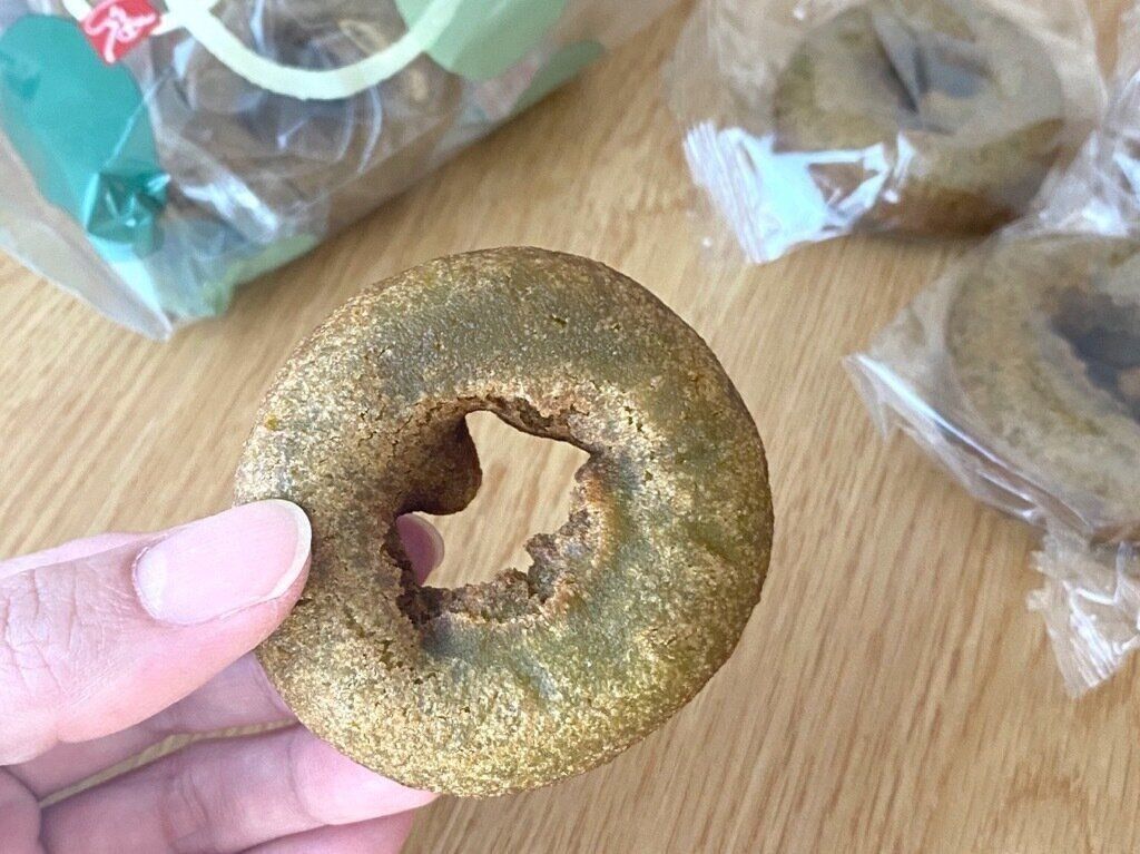 手に持っただけで生地のしっとり感が伝わってきます。甘さ控えめで素朴なドーナツの味わいに抹茶の風味がふわりと香り、後味に抹茶独特のほろ苦さをほんのり感じます。