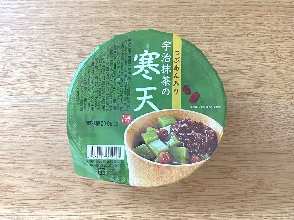 宇治抹茶を使用した寒天と、つぶあん、赤えんどう豆が入った贅沢なスイーツです。常温保存が可能ですが、冷蔵庫でしっかり冷やして食べると一層おいしく食べられます。