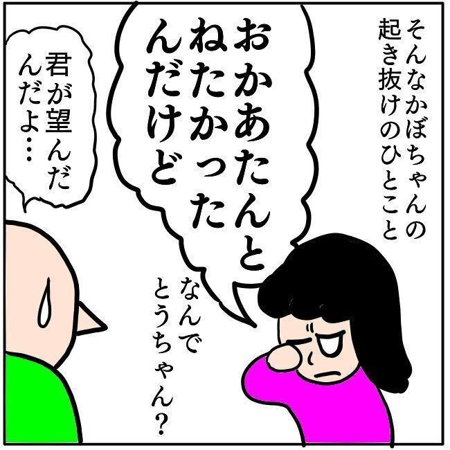 かぼちゃんの起き抜けのまさかの一言に笑ってしまいました。パパから「君が望んだんだよ…」と言われて、かぼちゃんはどのような反応でしたか。