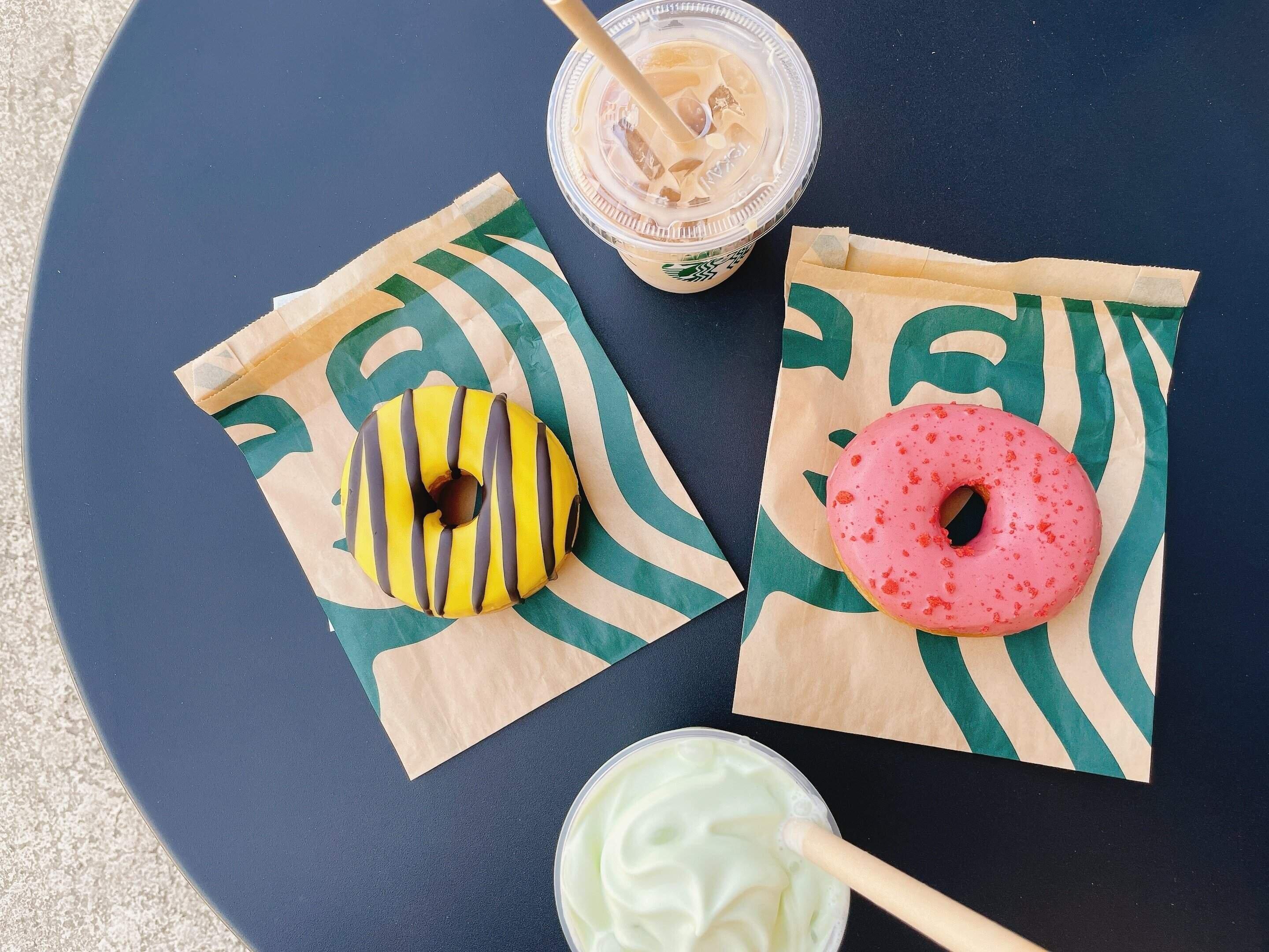 他にも鮮やかな色のバナナドーナツ、ストロベリードーナツ、オレンジandマンゴーのケーキなど夏らしいビビットカラーのフードやグッズが販売されています。