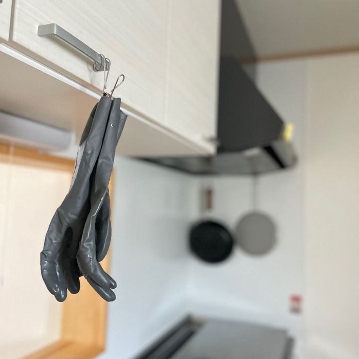 置き場に困りがちな「ゴム手袋」や「フキン」なども、挟んでシンク上の取っ手や背面収納のバーにひっかけることができるので、邪魔になりません。