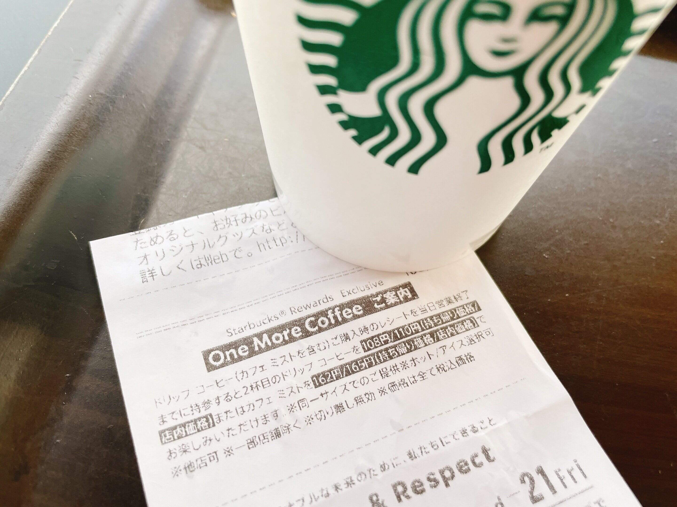 そのレシートを切り離したりせず、当日中にレジで提示すると一杯目と同じ以下のサイズのドリップコーヒーが186円/190円(持ち帰り価格/店内価格)、カフェミストが240円/245円(持ち帰り価格/店内価格)で購入できます。ちなみに1杯目のお会計をWeb登録済みのスターバックス カードで支払うと、2杯目のドリップコーヒーが128円/130円(持ち帰り価格/店内価格) 、 カフェミストが182円/185円(持ち帰り価格/店内価格)と、よりお得にone more coffee が利用できます。