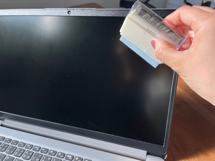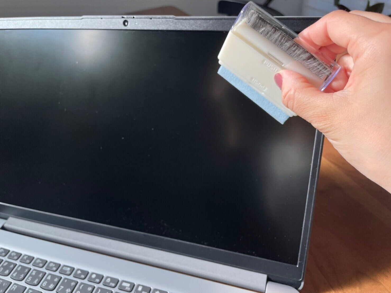 パソコンのディスプレイをスポンジ部分で拭いてみると、簡単にほこりや手跡を取ることができました。画面の汚れが気になるときに、さっと使うことができてうれしいですね。