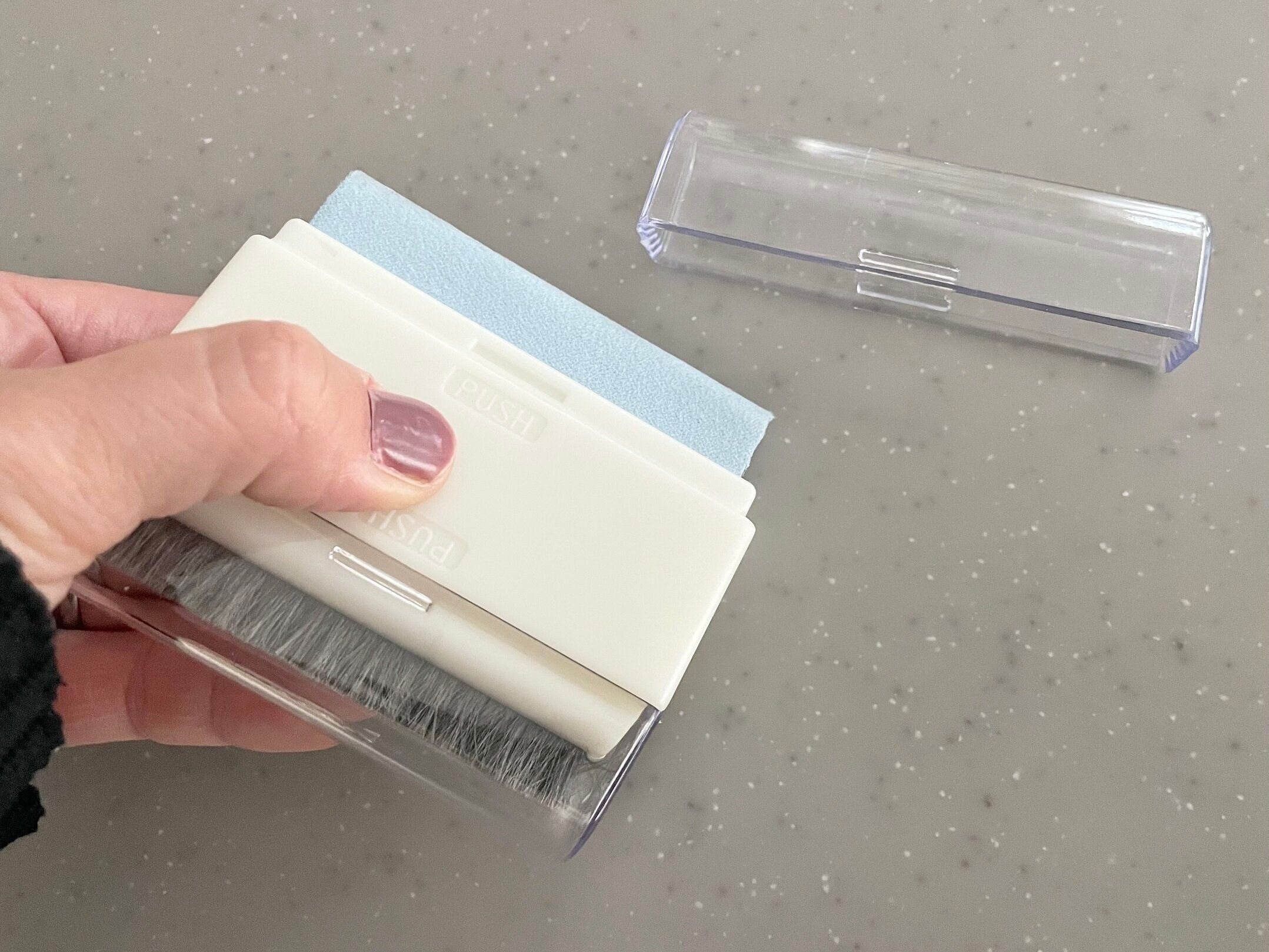 本体サイズは約幅7.7×高さ7×奥行き1.7cmで、価格は330円。使い方は簡単で、PUSHと表記があるところを押しながら透明キャップをあけて使用します。
