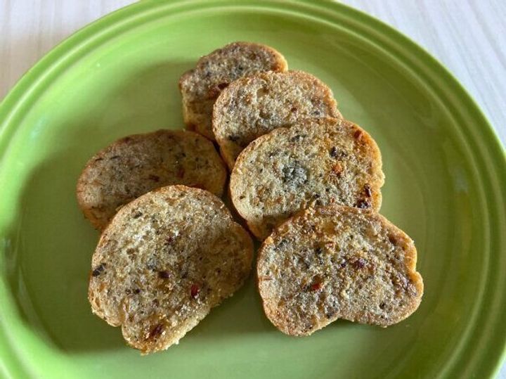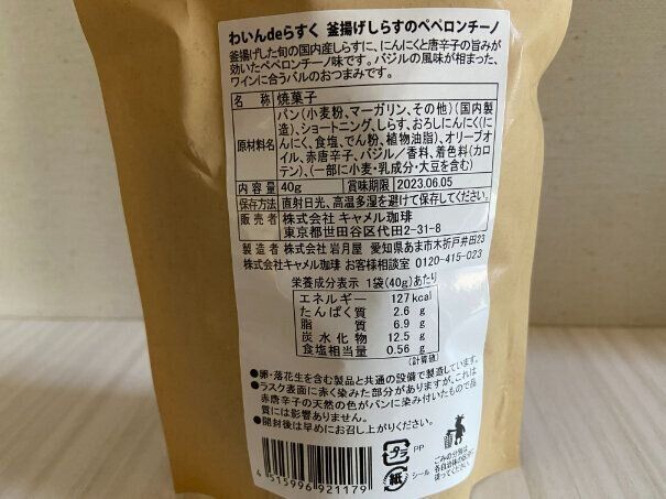 イタリアンレストランで出てきそうなメニュー名のようですが、実はこれワインに合うように作られたペペロンチーノ味のラスク。ペペロンチーノ、しかもしらすが使われたラスクはとってもオリジナリティありますね。