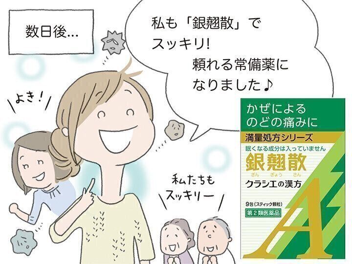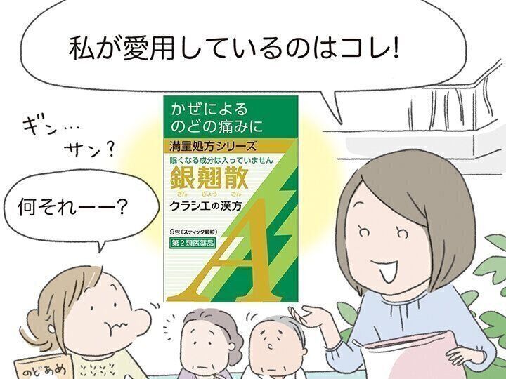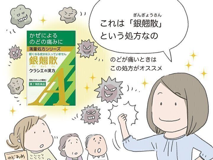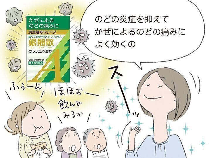 クラシエの「銀翹散」は、体の熱を鎮めてのどの炎症を抑え、かぜによるのどの痛みに効果を発揮します。かぜの引き始めにのどが痛くなる、イガイガする、のどに不調が現れるという人にぴったりの常備薬です。漢方薬は眠くなる成分が入っていないから、仕事や運転をする予定があっても、パフォーマンスを気にせずに、症状が出たときにすぐに飲めるから、かぜの引き始めにすぐに対策できる点も助かります。
