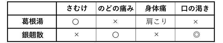漢方薬は、かぜの引き始めのタイプによって使い分けることができます。かぜの引き始めにのどが痛いときは「銀翹散」、かぜの引き始めにさむけが強いときは「葛根湯」と覚えておくといいでしょう。さらに、症状の出方によって以下のように使い分けることができます。