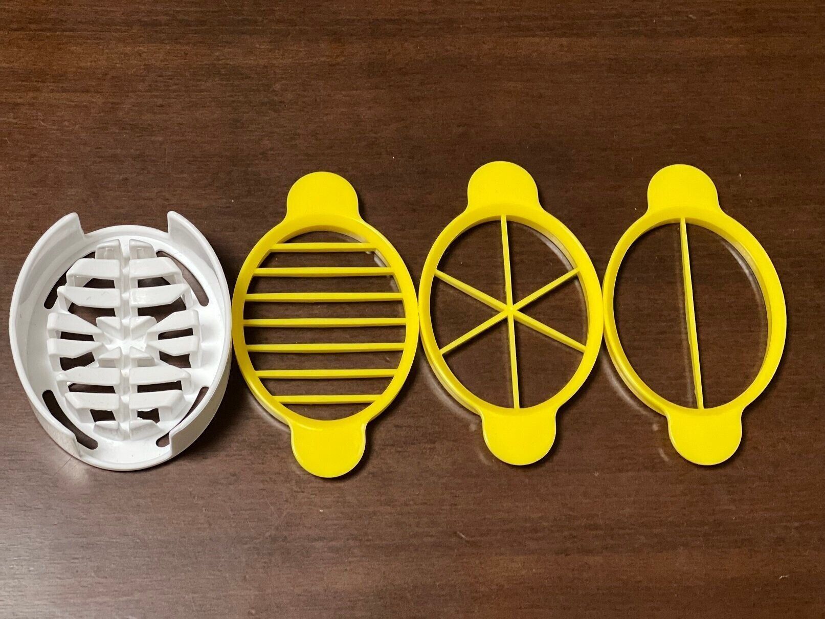 3種類のカッターは重ねてコンパクトに収納できます。いろいろな卵切り器を買いそろえるより、こっちの方が省スペースに収納できて便利ですね。