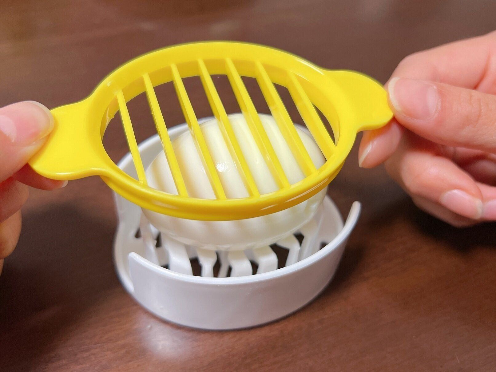 今回ご紹介するのは、ダイソーの「卵切り器」。スライスにしたり、ケーキ状に6等分したり、真ん中から2等分にしたりと、包丁を使わずに簡単に3WAYのカットができるすぐれものです。