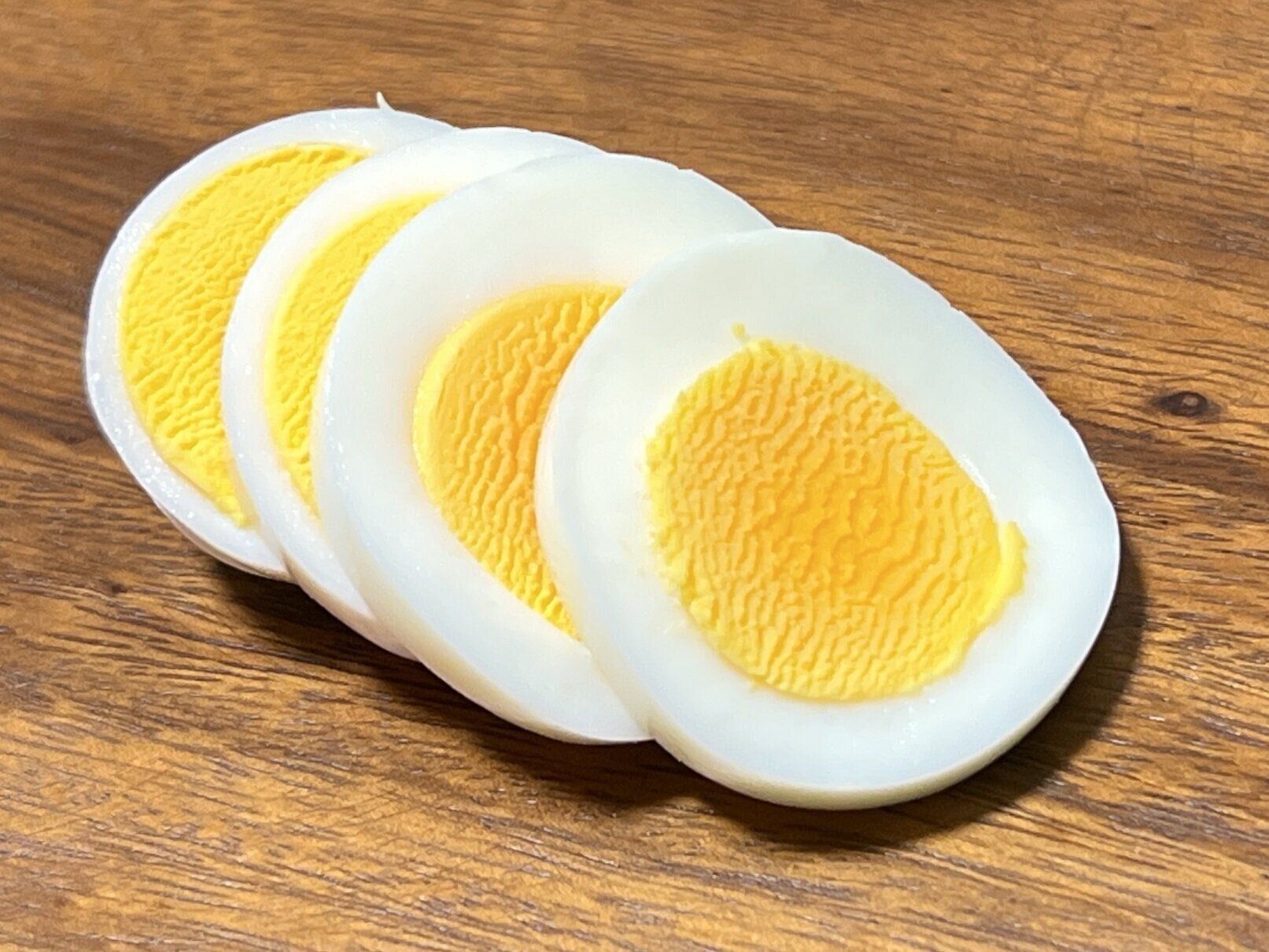 断面がガタガタになってしまったり、崩れてしまったりすることなく、キレイにスライスすることができました。なお、こちらの卵の茹で時間の目安は約12分。また、卵の種類や形状により均等に切れない場合もあります。