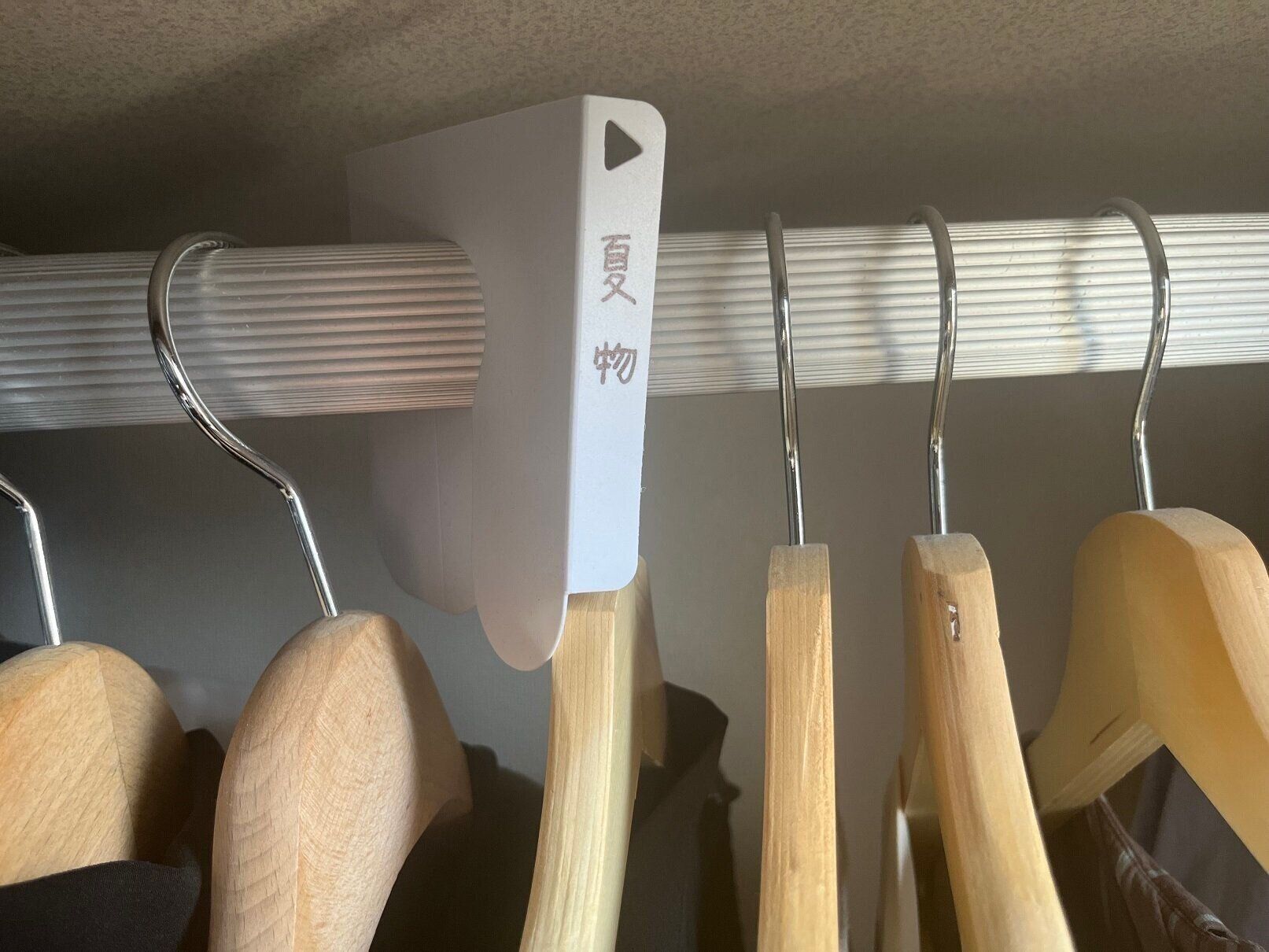 「○○ちゃん半袖」「○○ちゃん長袖」や「夏物」など明記して吊るす部分に引っかければ、一目でかかっている洋服の種類の境目がわかります。