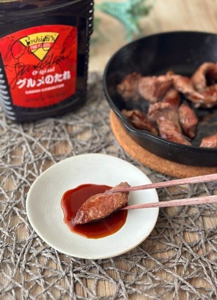 実際にたべてみると、甘みがしっかりあって、醤油ベースで、まさに日本人なら大人から子どもまで大好きな味。焼いたお肉をつけてたべても、肉に揉み込んでおいてから焼いてもどちらでもとってもおいしくいただけます。