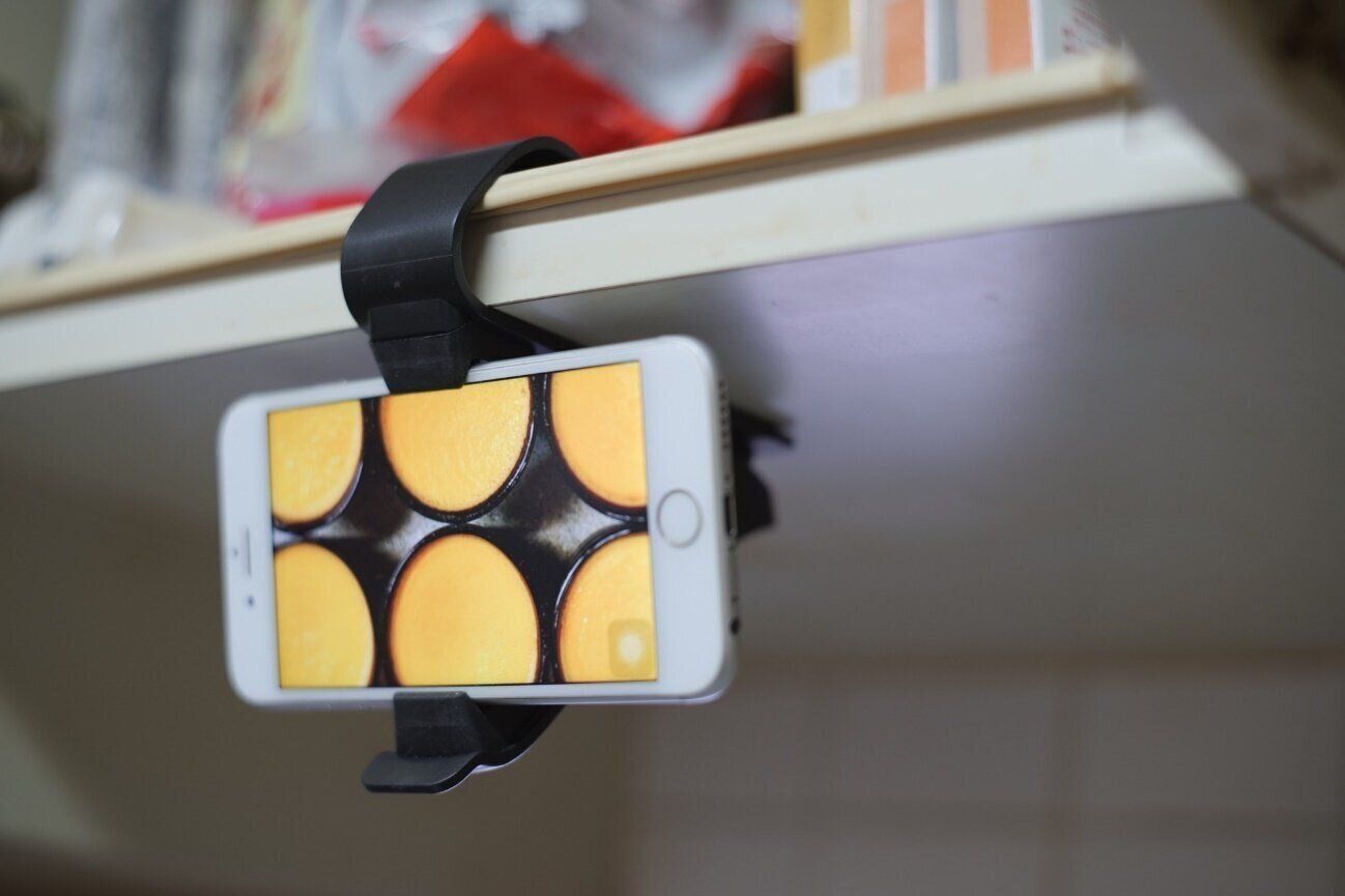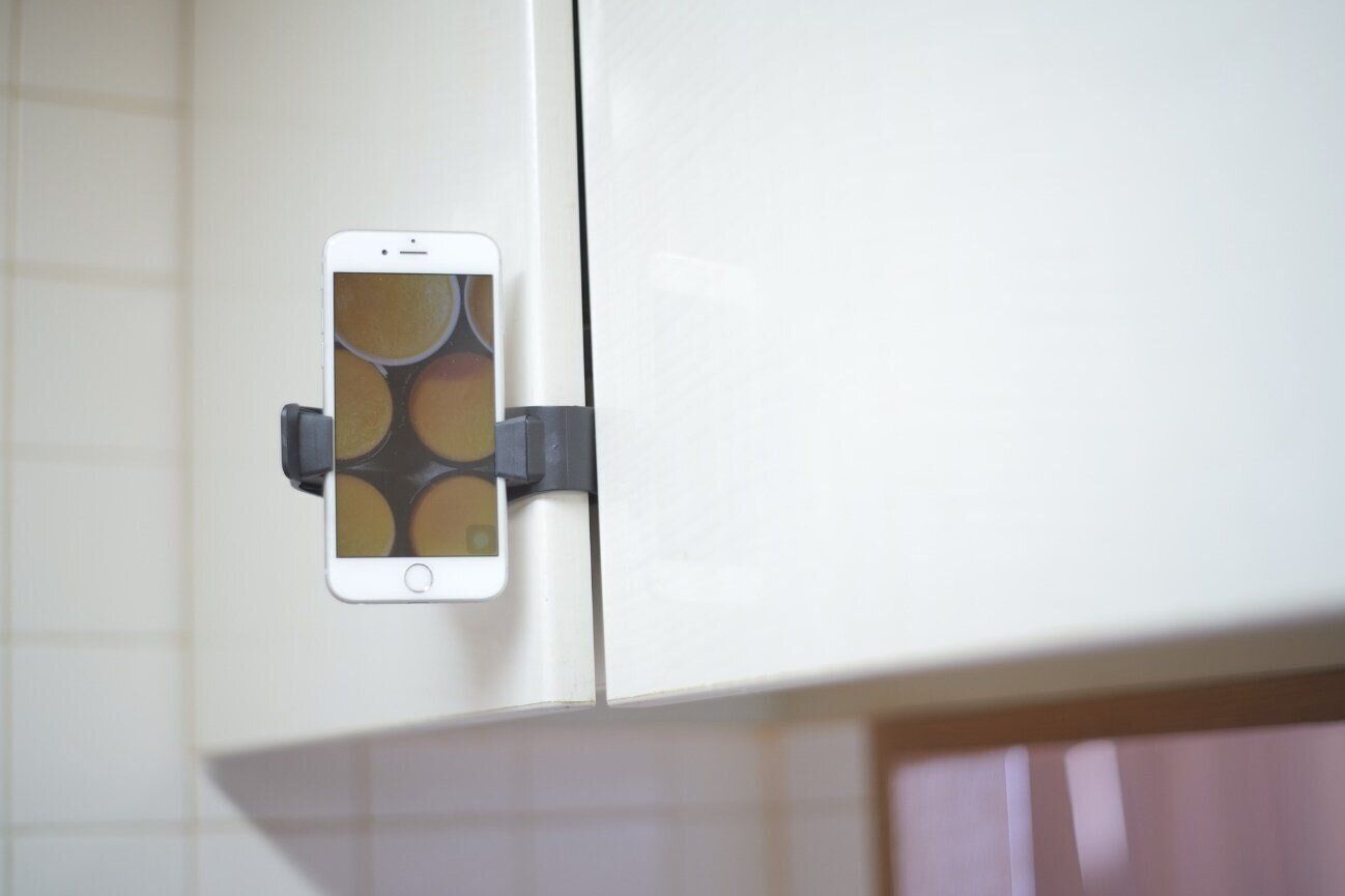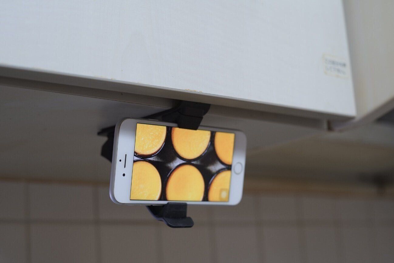 一般的にキッチンの棚は目線の少し上にありますから、このアイテムを使うとスマホがちょうど目線の高さにきます(縦置きの場合は少し目線より上)。顔を上下することなく、自然と画面を見ることができるので、慌ただしい料理の最中にもピッタリです。