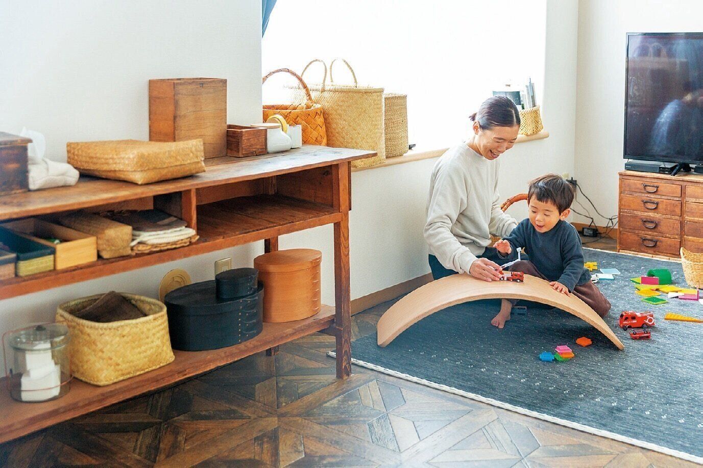 クッションフロアを敷いたリビング。カラフルなおもちゃも、生活感のあるものたちも、かごに収めればインテリアに。「祖父が使っていた机の引き出しも箱として活用」。