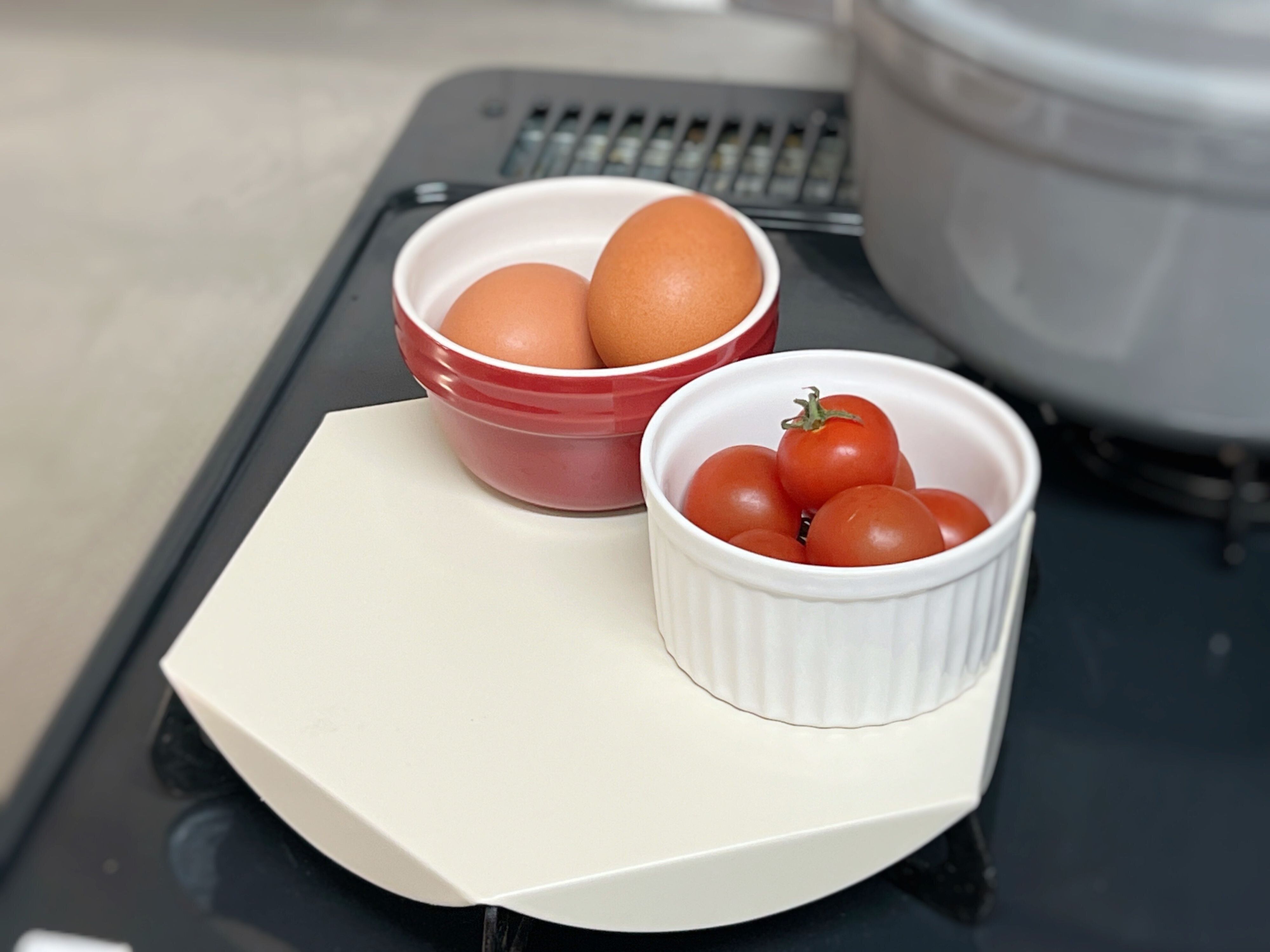 火を使わないときはちょっとした作業スペースとして使えて便利です。鍋のフタの一時置きに使ったり、食材や調味料のちょい置きに使ったりと、スペースを有効活用できます。