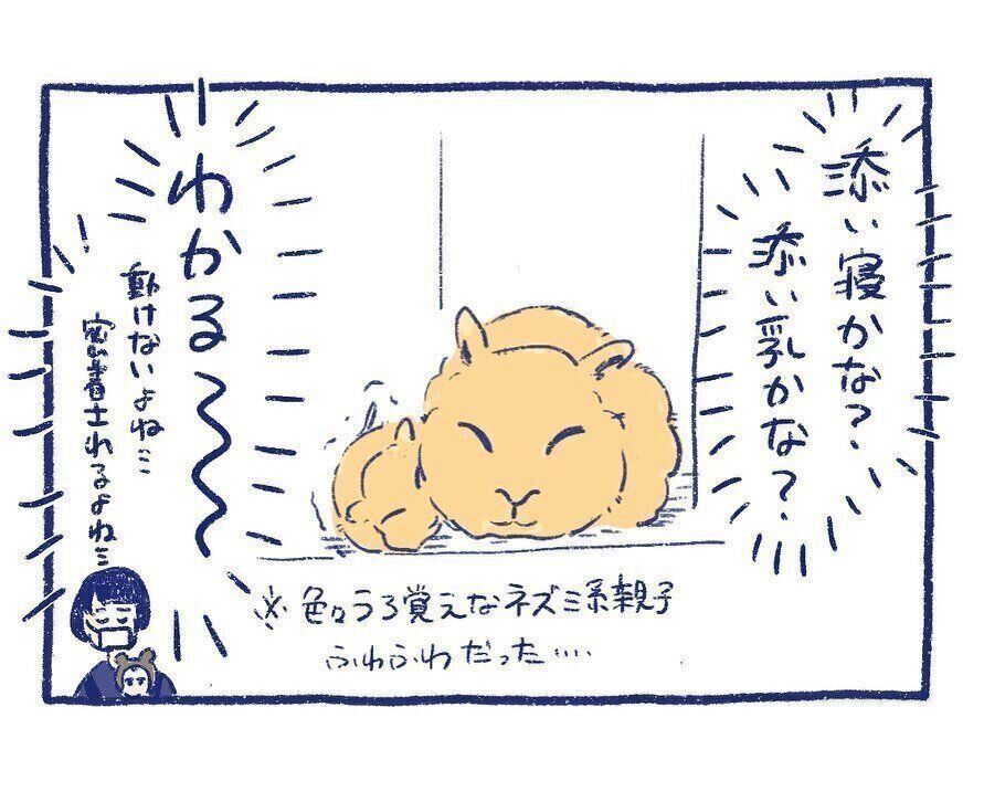 次に目に入ったのは、子どもに密着されて動けなくなっている、ふわふわのネズミ系親子です。