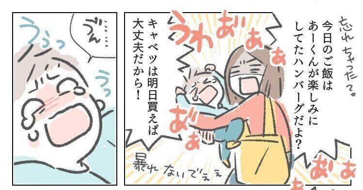 「今日の夕ご飯はあーくんが楽しみにしてたハンバーグだよ?キャベツは明日買えば大丈夫だから!」と暴れるあーくんを精一杯抱きしめますが、