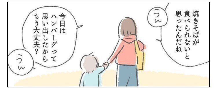 「焼きそばが食べられないと思ったんだね。今日はハンバーグだからもう大丈夫?」という質問にも「うん」「うん」と小さくうなずきます。
