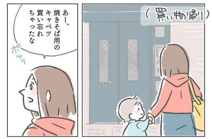 買い物帰りにエレベーターを待っていると、焼きそば用のキャベツを買い忘れたことに気がついたにいどゆうさん。ポツリと呟いたその言葉をあーくんは聞いていました。