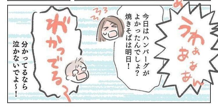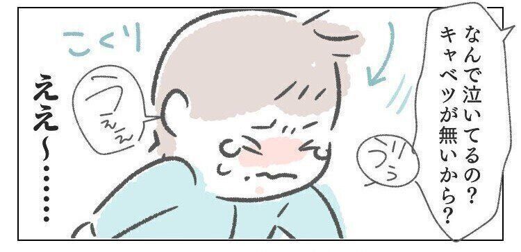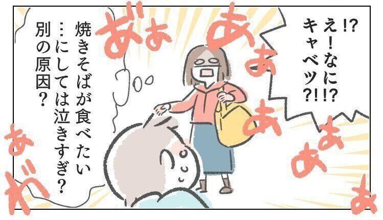 にいどゆうさんは、あーくんの激しい泣きっぷりに「え!なに!?」と困惑します。キャベツの買い忘れが原因で大好きな焼きそばが食べられないと思ったのでしょうか。